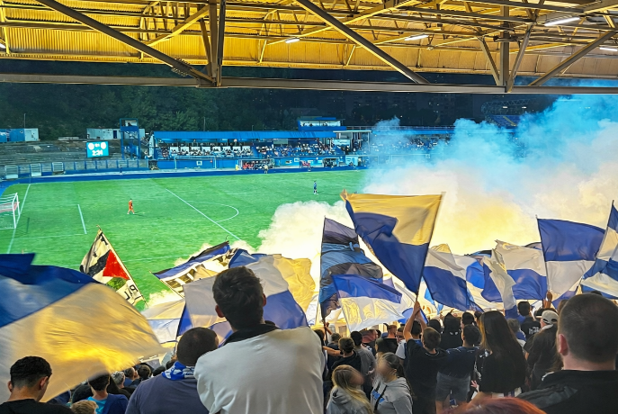 Krátká symbolická prohlídka od dědečků ve vestách zaměstnaných jako security, vycházíme schody a zjišťujeme, že pán v okýnku na lístky nás asi zas tolik nepochopil. Náš sektor je přesně sektor vlajkonošů domácích, tedy kotel. Po krátké domluvě usuzujeme, že se nám to nechce řešit a aspoň to bude silný zážitek. Zakrátko se dáváme do řeči s několika fanoušky, kteří nám říkají, že jim připadá naprosto v pořádku, že tam jsme. Upřímně, já bych asi neměl vyloženě radost, že mi do kotle lezou turisté, na druhou stranu, pokud by se chovali slušně a občas něco zaskandovali, je to vlastně úplně OK. Naprostá většina lidí pochopitelně stojí a fandí, ale kdo si chce sednout, ten si s sebou nosí igelit nebo kus kartonu a izolepu, kterými obalí sedačku, aby se neušpinil. Vypadá to, že s čištěním míst pro sezení se tu nikdo už dobrou řádku let nezabýval.